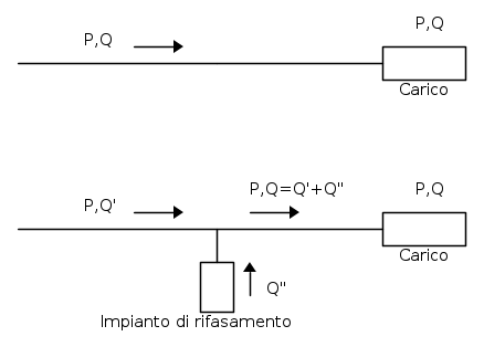 La potenza reattiva del carico non può essere diminuita: assorbe quella necessaria al suo corretto funzionamento. Quello che possiamo fare è evitare il transito di Q lungo la linea, producendola in prossimità del carico.