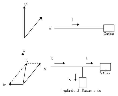 Diminuisce la potenza reattiva assorbita dal complesso carico + condensatore di rifasamento; il carico, assorbirà la potenza reattiva che gli serve attingendo sia dalla rete che dal condensatore!