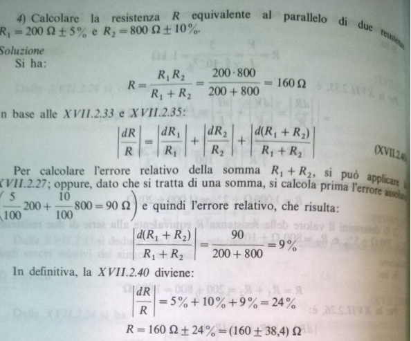 I calcoli che hai fatto sopra sono corretti e hai dimostrato di saperli fare. Ciò che hai sbagliato è la propagazione dell'errore. Se nella somma di due valori il risultato è affetto dalla somma degli errori, per il rapporto non è così. Quella che ti ho scritto è la formula della propagazione dell'errore per il rapporto di due valori. Se applichi questa formula al caso del parallelo delle resistenze, vedrai che il risultato sarà diverso.