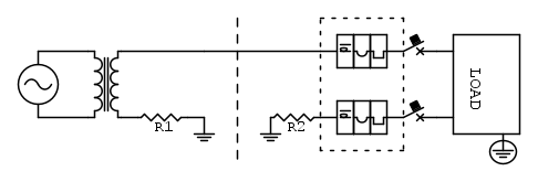 Descrivo la "cacata" di circuito disegnata. Abbiamo un generatore sinusoidale (non ci interessa al momento cosa chi e percome stiamo semplificando un casino) un trasformatore di isolamento e mettiamo un picchetto a terra sul conduttore che definiamo neutro con resistenza di contatto di terra R1. L'altro cavo lo tiriamo e diciamo sia lungo a piacere.