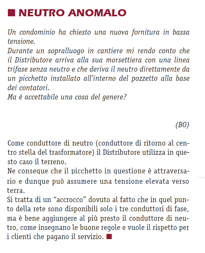 A riprova che una cosa del genere non si fa aggiungo, mi prendi un impianto monofase domestico fatto così: contatore, palizza a terra, un solo cavo fino a casa, palizza e quadro? Faccio anche 1000km di auto per venirlo a vedere.