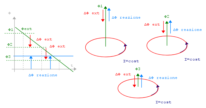 NON si oppone alla diminuzione del flusso concatenato. Il flusso concatenato è dato dalla somma del flusso esterno e del flusso dovuto alla corrente. Se la corrente è costante, il flusso concatenato diminuisce costantemente e la corrente non oppone nessun contrasto. In particolare, la diminuzione è la stessa, entro e fuori la spira, prova che la corrente non oppone nessun contrasto.