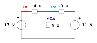 17 \ \text{V} \cdot 8 \ \text{A} - 11 \ \text{V} \cdot 5 \ \text{A} - I_x \cdot 4 \ \Omega \cdot 8 \ \text{A} - I_x' \cdot 5 \ \Omega \cdot 3 \ \text{A} - I_x'' \cdot 3 \ \Omega \cdot 5 \ \text{A} = 0
