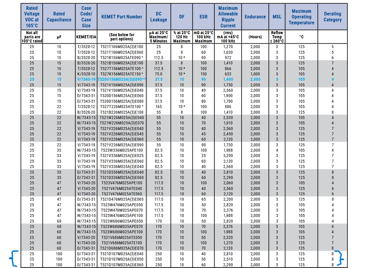 I Kemet T521 da 25v 100uF (secondo questo documento: https://www.mouser.it/datasheet/2/447/K ... 699828.pdf )