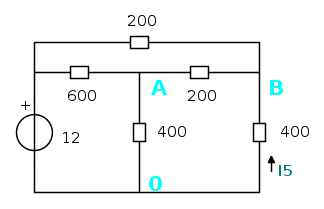 & \frac{12-V_{B}}{0.2}+\frac{V_{A}-V_{B}}{0.2}-\frac{V_{B}}{0.4}=0 \\