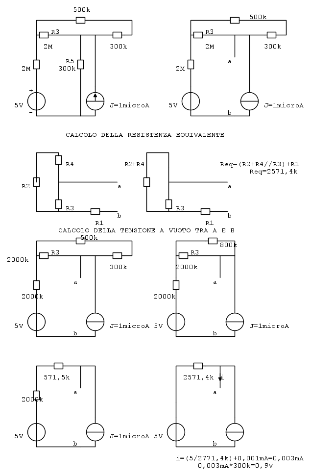 Come potete vedere, prima di tutto trasformo le resistenze di 2M in 2000k per uniformarle alle altre. A questo punto calcolo la Req. Per il calcolo ridisegno il circuito in quel modo e trovo che R4 è in serie a R2 e R4+R2//R3. Poi tutto è in serie con R1. Trovo Req che è uguale al valore del disegno. A quel punto per la tensione a vuoto faccio quello che vedete ma sicuramente è tutto sbagliato perché Pr5 deve venire 2,08microW. Cosa sbaglio? Il mio problema è rconoscere quando le resistenze, in un circutio di forma un o strana, sono in parallelo o in serie. Alla fine vedo i con Kirchhoff come la somma delle 2 correnti e trovo Vab facendo i*R5 e poi la potenza i^2*R5 ma non mi viene qul risultato.
