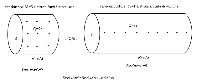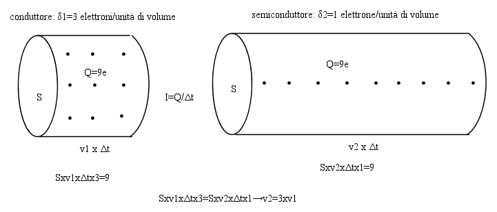 In un pezzo di materiale a sezione circolare, il cilindro che ha per base la sezione e che contiene tutte le cariche che l'hanno attraversata nell'intervallo di tempo considerato, deve avere nei semiconduttori un'altezza molto maggiore che nei conduttori per contenere lo stesso numero di cariche nei due casi, cosa che significa che l'intensità di corrente è la stessa.