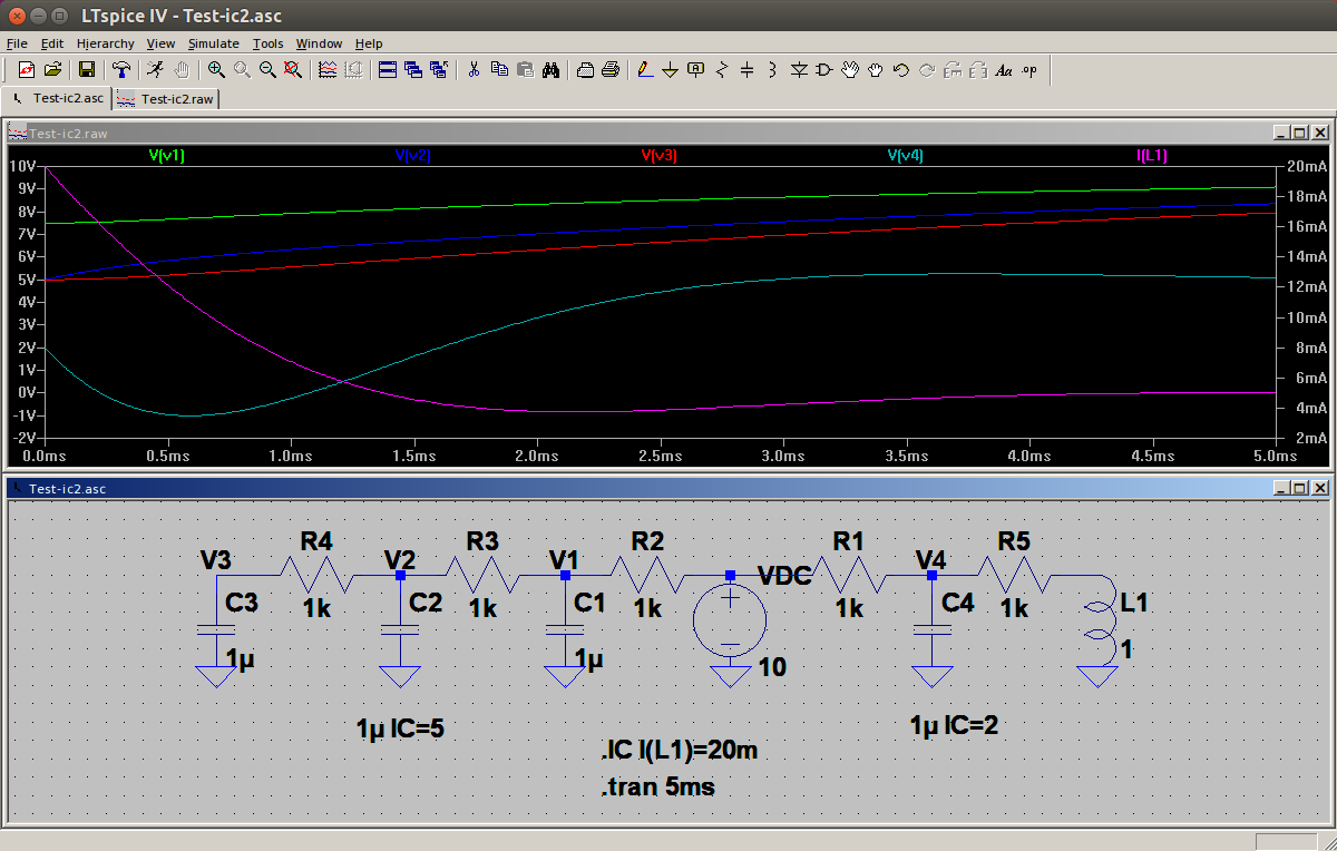 SI vede che le tensioni su tutti i condensatori sono nulle, tranne C2, ma questa tensione di 5V non si "propaga" su C3. Questa volta la condizione iniziale sull'induttanza e` presente, la corrente I(L) parte da 20mA, ma questa "corrente" non scorre da nessuna parte, non va a caricare inizialmente C4, che parte anche lui da tensione nulla.
