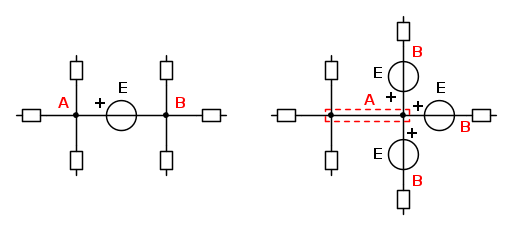 No, qui non sostituiamo nessun ramo, ma "dividiamo" l'azione di un generatore gia' presente dividendo, per il generatore di tensione e di corrente, rispettivamente un nodo ed una maglia; diciamo che e' una modifica topologica elettricamente equivalente in quanto fra i tre nodi B del primo caso non c'e' differenza di potenziale e quindi possiamo considerarli "virtualmente cortocircuitati", mentre dualmente il ramo addizionale del secondo caso, essendo percorso da corrente nulla, lo possiamo considerare "virtualmente aperto".