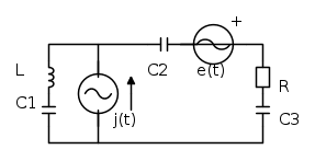 Conosco i valori di tutti i bipoli passivi tranne la resistenza R, e il valore di e(t) e di j(t). Inoltre conosco il valore della potenza Apparente A_{E}. Facendo due conti, L e C1 sono in risonanza serie, e quindi complessivamente li posso sostituire con un cortocircuito ideale.