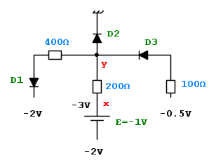 b) visto che il catodo del diodo D2 è collegato al punto a potenziale minimo, esso sarà di di sicuro in conduzione dato che esiste un percorso "libero", che a partire da x, permette ad una corrente di fluire in esso; il potenziale di y sarà di conseguenza nullo; D2 ON