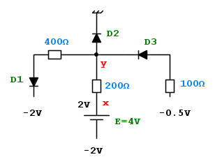 b) ipotizzando Vy<0 e quindi D2 interdetto, verifichiamo la correttezza di detta ipotesi calcolando la corrente che verrebbe a scorrere dai 0,5 volt attaverso D3 e attraverso E