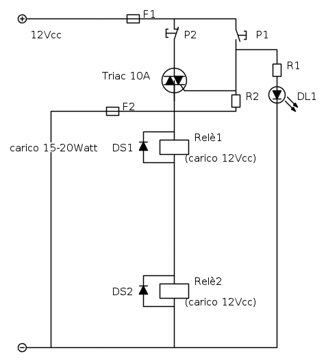 F sono fusibili, i due diodi servono per la scarica dei relè quando si diseccitano, il led dl1 si accende solo durante la pressione di P1, R2 (alto valore ohmico) serve ad evitare che si attivi accidentalmente il triac; il carico 15-20Watt sono luci.