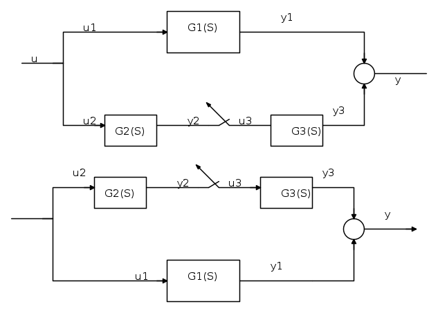 . Se il sistema è lineare puoi considerare l'uscita come somma delle f.d.t. dei due rami: puoi calcolarti