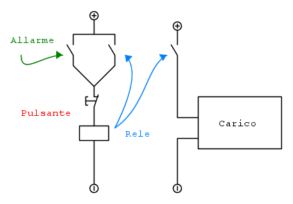 quando il tuo segnale di allarme chiude il circuito il relè si eccita e provvede a chiudere 2 interruttori, uno alimenta il tuo carico, l'altro provvede a fornire i 12V al relè stesso, in modo che quando l'allarme cessa di alimentare il relè questo non si spegerà.