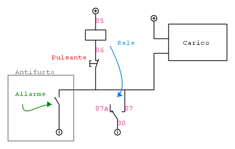 Ciao, devo fare un circuito così per la mia macchina. Ho un antifurto che quando suona per qualche secondo da tensione ad una uscita a 12v. Io devo avere una presa che quando l'antifurto suona mi devono arrivare 12v fino a quando non la disattivo io.