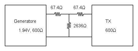 Sia l'ingresso che l'uscita dell'attenuatore sono a 600Ω: con il circuito inserito dovresti vedere 1V all'uscita del generatore e 0.774V all'ingresso del trasmettitore. Se stacchi il trasmettitore, all'uscita dell'attenuatore dovresti vedere 1.548V.