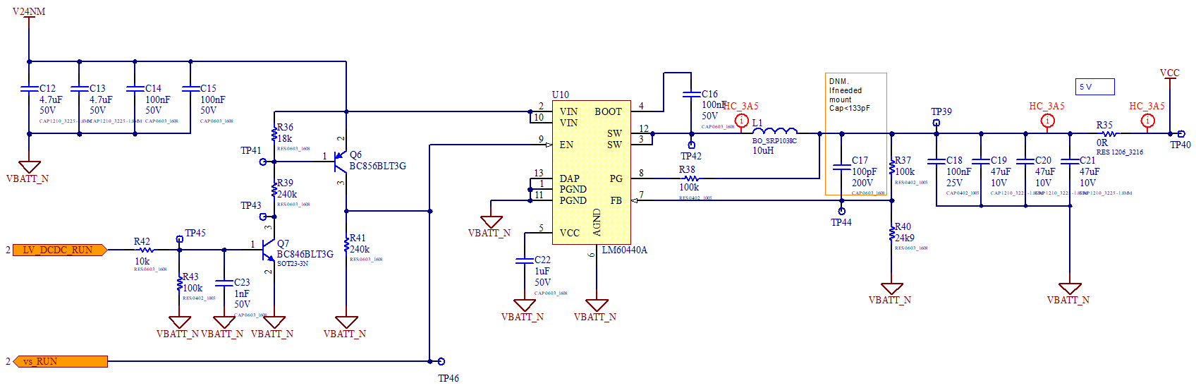 La scheda di controllo si è rotta al momento dell'apertura ed il DC/DC converter principale è lettaralmente "esploso".Questo buck converter si alimenta dalla tensione di batteria e converte i 24 V nominali (circa 20-30 V il range reale di ingresso) in 5 V DC con correnti max di 3 A anche se i consumi nominali sono di poche centinaia di mA. A valle ci sono degli LDO per la conversione a 3,3 V e 3,6 V ed altri IC, fra cui microcontrollori, opamp, low-side ed high-side switches a MOS, fotoaccoppiatori, transceiver CAN, RS485, ethernet, ecc. Posto di seguito lo schema circuitale del DC/DC: