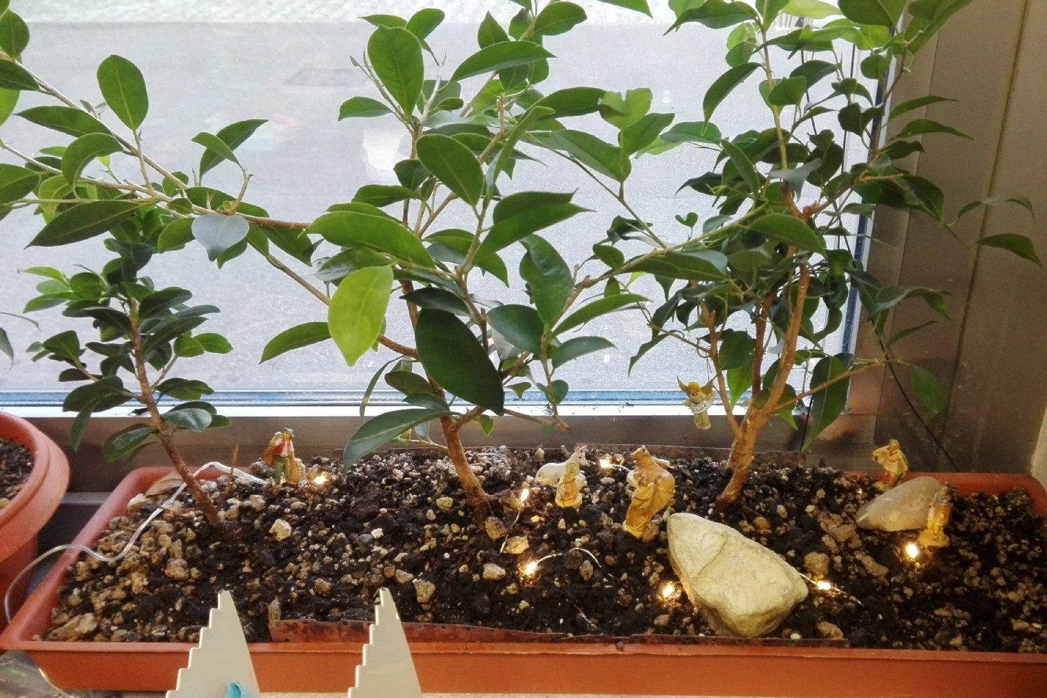 niente di che, ma il mio presepino da ufficio sotto i ficus "bonsai" non posso non metterlo, ha pure illuminazione a LED (3€ al Leroy)