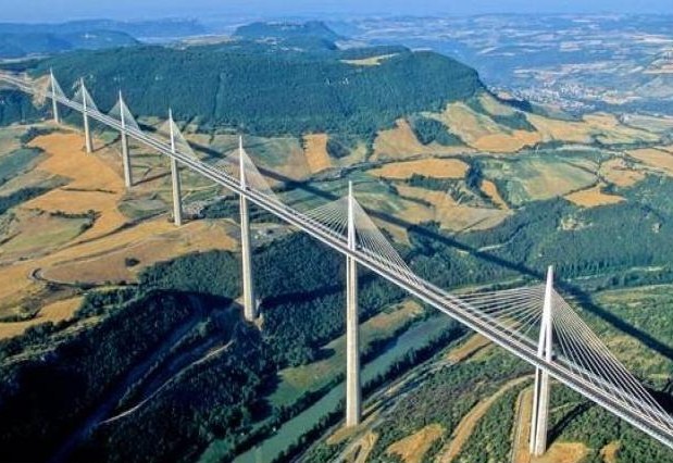 Questo sapete dov'è? E' in Francia, viadotto di Millau, inaugurato pochi anni fa. E' un ponte a stralli come si può ben vedere, ed è pure curvo. I piloni sono in cemento armato, tutto il resto è stato costruito con la tecnica dello strisciamento delle parti da un punto all'altro fino a toccarsi con precisione millimetrica, grazie al gps.