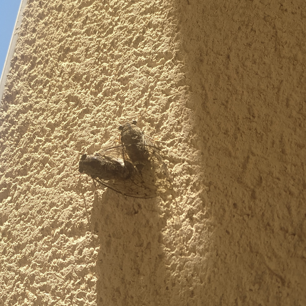 Due cicale in accoppiamento. Al maschio (non saprei dire qual'é fra le due perché mi sono perso il momento dell'incontro) sono bastati pochi minuti di "canto" per corteggiare con successo.