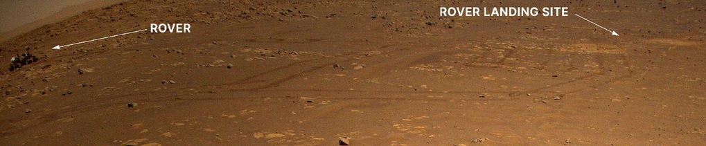Intanto questa è l'immagine catturata dallo stesso Ingenuity che include il suo compagno Perseverance(nel margine sinistro) e il punto in cui con lo stesso era ammartato: