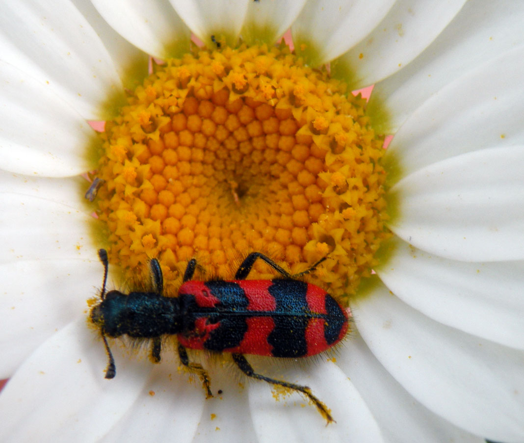 questo è uno scarabeo lanuginoso a strisce nero rosso che ho fotografato una decina di anni fa, il bello delle macro estemporanee o casuali è trovarsi davanti ad un fiore ad un insetto che li per li non vorresti neanche fotografare perché ti sembra insignificante per poi ricrederti quando li metti nel computer visto che le hai scattate ad una risoluzione di 300 o 600 DPI e vedi tutti i peli che ad occhio nudo non si vedono, ti trovi davanti un mondo fantastico. I professionisti mettono gli insetti nel congelatore per una decina di minuti e poi li preparano su un fiore, foglia o altro, ma se guardate attentamente si riconoscono dalla posizione non naturale e le gambine irrigidite. Questa foto e naturale e si vede perché l'insetto è rilassato.