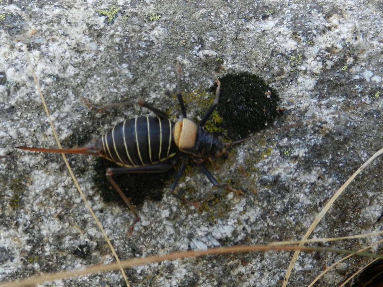 Quell'insetto ha un'appendice, una specie di "pungiglione" che si vede meglio in quest'altra foto, purtroppo un po' sfocata. Non ha ali, ha le antenne fini e lunghe, e il corpo escluse antenne e pungiglione era lungo un paio di centimetri, quindi piuttosto grosso per gli insetti delle nostre latitudini: