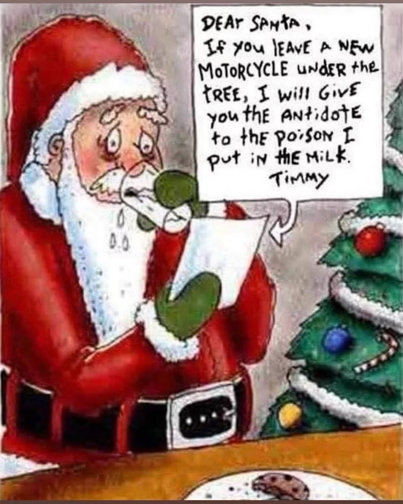 (per chi non sapesse l'inglese, "caro babbo natale, se lasci un motorino nuovo sotto l'albero, ti do l'antidoto per il veleno che ti ho messo nel latte"