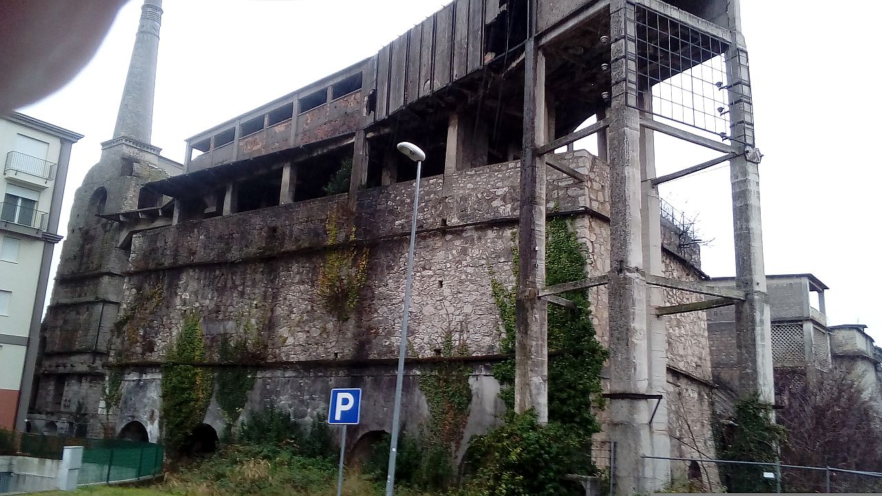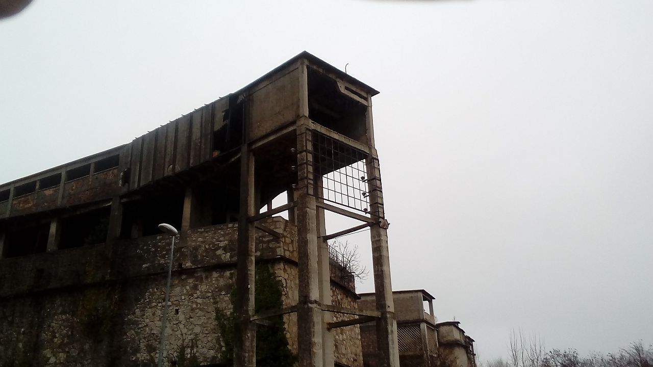 Non c'erano indicazioni di cosa fosse stato un tempo, probabilmente una specie di fabbrica, ma vai a sapere di cosa ... la presenza di due ciminiere (da dove ho potuto fermarmi se ne vedeva una sola, l'altra rimane nascosta, all'angolo opposto del corpo principale, purtroppo era l'unico posto da cui poter scattare), con quella strana struttura a cupola con gli archi subito sotto la canna fumaria, unite a passerelle esterne ai muri ed a quel "tunnel" aerato (che probabilmente proseguiva in origine fino oltre la strada, sostenuto dal grosso pilone a bordo strada, ma non ne rimane altro) mi fa sospettare un qualche tipo di cottura, magari ceramiche o mattoni o vai a sapere cosa, anche per il fatto che molte pareti sono dotate di feritoie di aerazione o addirittura fatte di griglie di cemento traforate, forse per disperdere il calore.