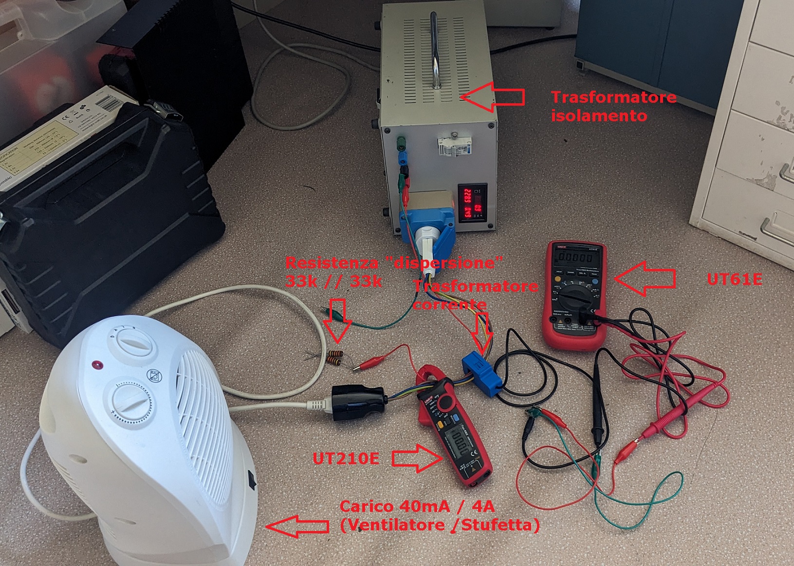 E' stata aggiunta una resistenza "equivalente" 16k 4W (2 x 33k 2 W in parallelo) per simulare una dispersione di circa 14 mA "esterna" all'amperometro a tenaglia UT201E / Current transformer.