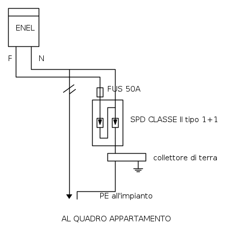 Scusate la mia intromissione, ma da quanto vedo negli schemi viene installato un SPD di classe II in prossimità del contatore , praticamente a monte della linea dorsale che andrà ad alimentare il Q.G. appartamento. Secondo me l'installazione non è corretta. L' SPD di classe II non sono adatti alla protezione contro le scariche dirette ma possono essere impiegati quando si debbano scaricare correnti provocate da sovratensioni indotte o piccole parti della corrente di fulmine: all'ingresso delle linee di alimentazione delle strutture senza LPS esterno, nei quadri divisionali se distano più di 10 m dal quadro principale.