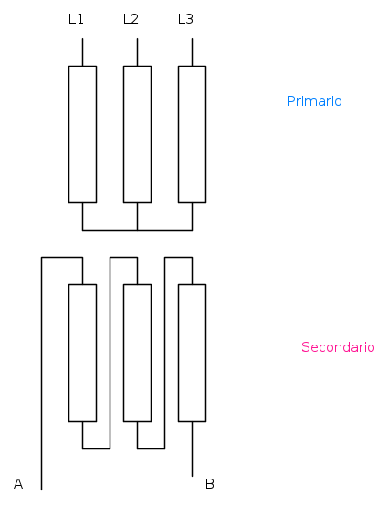 A mio avviso..siamo è stato adottato un trafo trifase con il primario ed il secondario utilizzati al contrario...