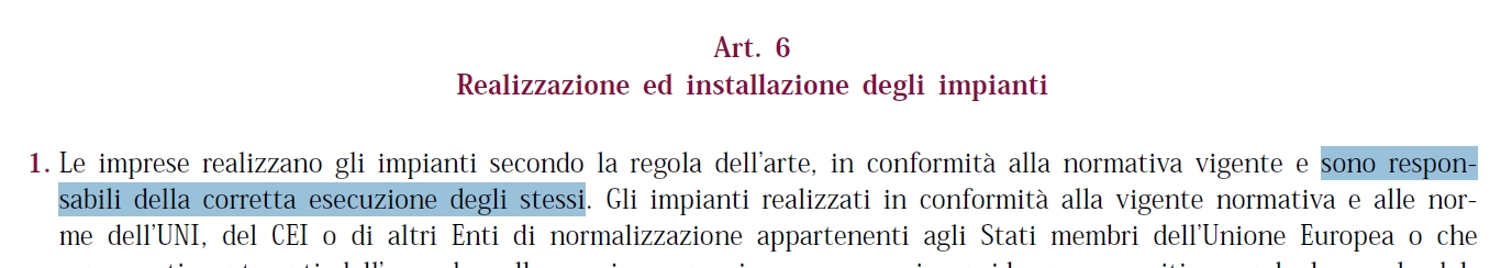 Quindi non basta fregarsene e dire: tanto anche se è sbagliato la colpa è del progettista, anzi, può essere che ne risponde solo l'elettricista perché il progetto è un'opera virtuale e anche se fuori norma non fa male a nessuno, mentre l'installatore eseguendo l'opera, collaudandola e consegnandola diventa il vero responsabile.
