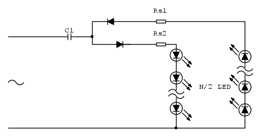Non vedendo un ponte intero, ma due soli diodi e due resistenze oltre ad un condensatore, credo lo schema sia il seguente: