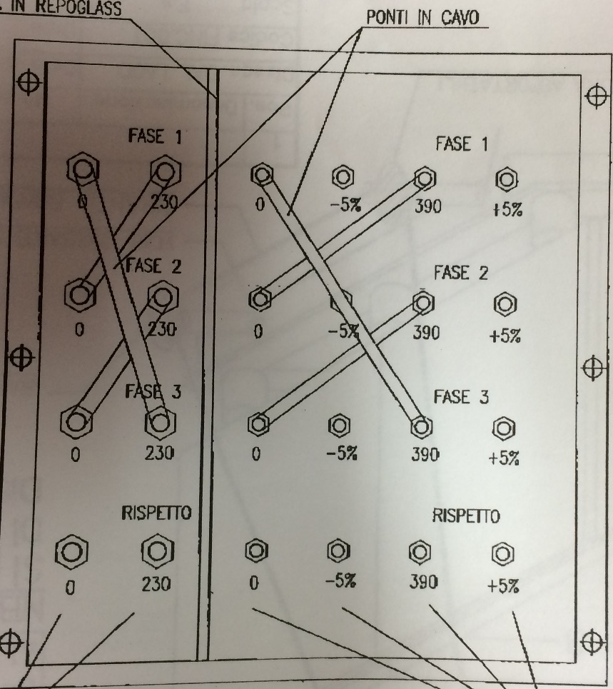 Dalla misura effettuata sulla presa si intuisce che il sistema è monofase in derivazione a tre conduttori 230/115V, con punto medio del trasformatore a massa.