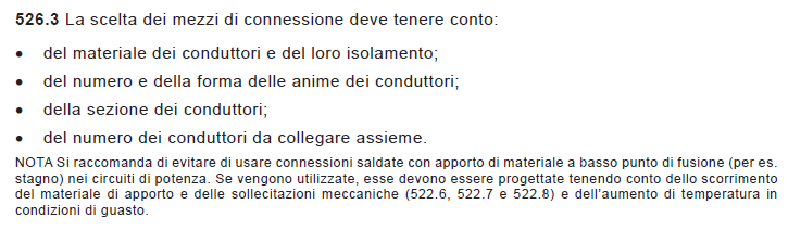 NOTA Si raccomanda di evitare di usare connessioni saldate con apporto di materiale a basso punto di fusione (per es. stagno) nei circuiti di potenza. Se vengono utilizzate, esse devono essere progettate tenendo conto dello scorrimento del materiale di apporto e delle sollecitazioni meccaniche (522.6, 522.7 e 522.8) e dell’aumento di temperatura in condizioni di guasto."