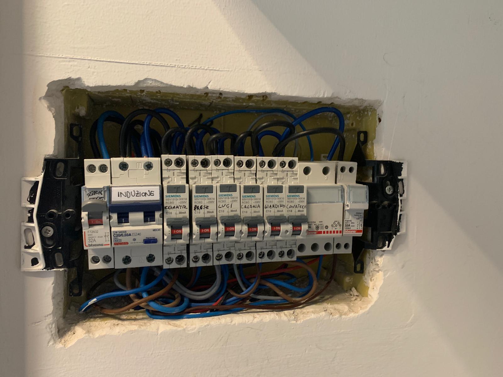 ho terminato il cablaggio dei differenziali magnetotermici siemens , induzione e sezionatore da 32A. Il cablaggio sotto lo sistemerò con i vari puntalini