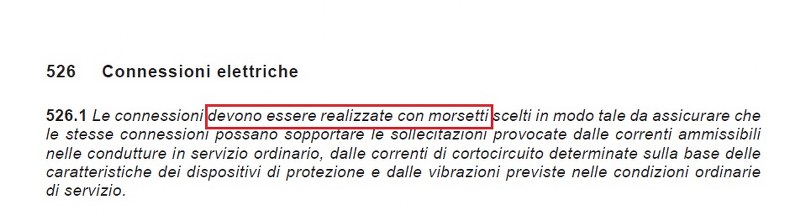 "Le giunzioni e le derivazioni devono essere eseguiti con appositi dispositivi di connessione (morsetti) aventi grado di protezione IPXXB; non sono quindi ammesse quelle eseguite con attorcigliamento e nastratura." ...