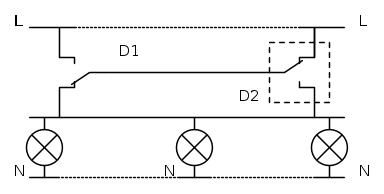 La logica di funzionamento è la stessa solo che il carico è stato spostato dal conduttore centrale "verso" il neutro dell'impianto. Lo ritengo interessante per applicazioni come corridoi comandati da due punti con diverse lampade tra i due deviatori.