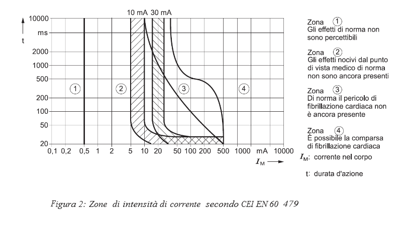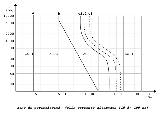 Nella zona AC-1 la corrente può essere percettibile senza tuttavia dare luogo ad alcuna reazione. In AC-2 normalmente non si incorre in fenomeni patologici pericoloso, fino alla soglia di tetanizzazione. In AC-3 è altamente probabile il verificarsi di effetti fisiopatologici solitamente reversibili quali contrazioni muscolari, difficoltà respiratorie, aritmie e arresti temporanei del cuore, difficilmente si innesca la fibrillazione ventricolare. La pericolosità aumento con l'aumentare del tempo e della corrente. Infine, nella zona AC-4, la fibrillazione ventricolare è altamente probabile, così come l'arresto respiratorio e la formazione di ustioni. Le curve tratteggiate C2 e C3 sottointendono una probabilità di innesco di fibrillazione ventricolare rispettivamente pari al 5% e al 50%.