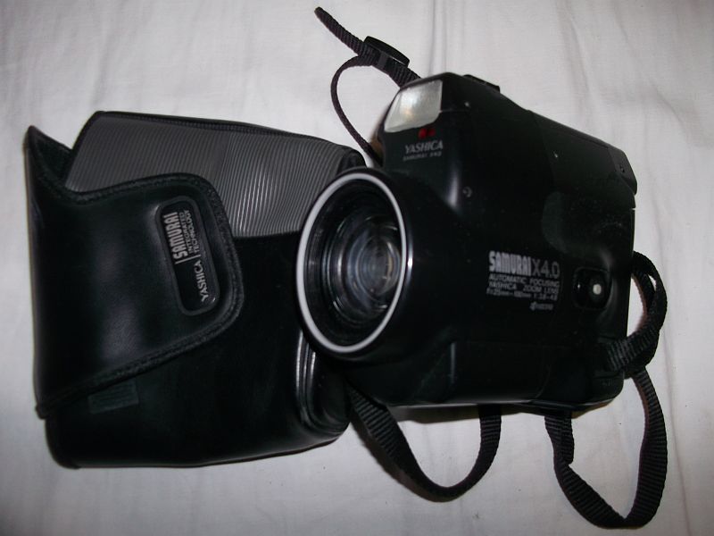 Ed una Yashica "Samurai", dei primi anni 90 credo, nonostante sembri una cinepresa, in realta' e' una macchina fotografica con zoom, autofocus e programmi elementari, costruita per essere usata comodamente con una mano sola, era "mezzo formato", la pellicola 24x36 standard scorreva in verticale e le foto erano impresse ruotate di 90 gradi in formato 18x24, per cui un rullino da 36 ne poteva contenere 72.