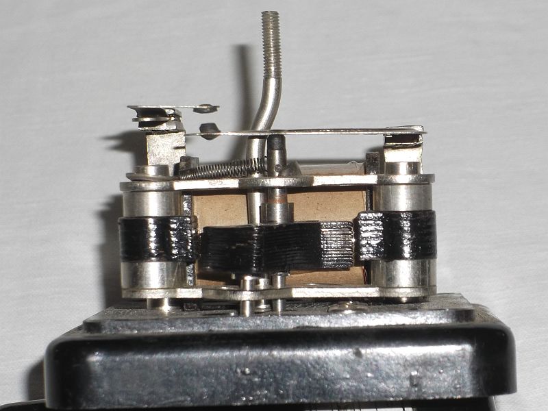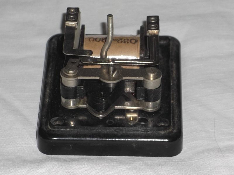 Mi e' capitato in mano uno stranissimo rele', abbastanza vecchiotto (ha la custodia in bachelite nera), ma e' il tipo di funzionamento meccanico che non mi ricordo di aver mai visto ... l'ancorina invece di traslare come nei classici rele', ruota su un'asse di un'ottavo di giro (c'e' un perno che non gli permette di fare di piu) fra due espansioni polari provenienti dalla bobina, e mentre ruota, un risalto di fianco all'asse ingaggia l'astina della molla di ritorno spostando l'intero gruppo verso l'alto, in modo che l'asse spostandosi chiuda il contatto spingendolo verso l'altro, mentre in fase di rilascio e' l'elasticita' del contatto "mobile" che rispinge il gruppo nella posizione originale (meglio di cosi con la compattina che ho non riesco a fotografarli).