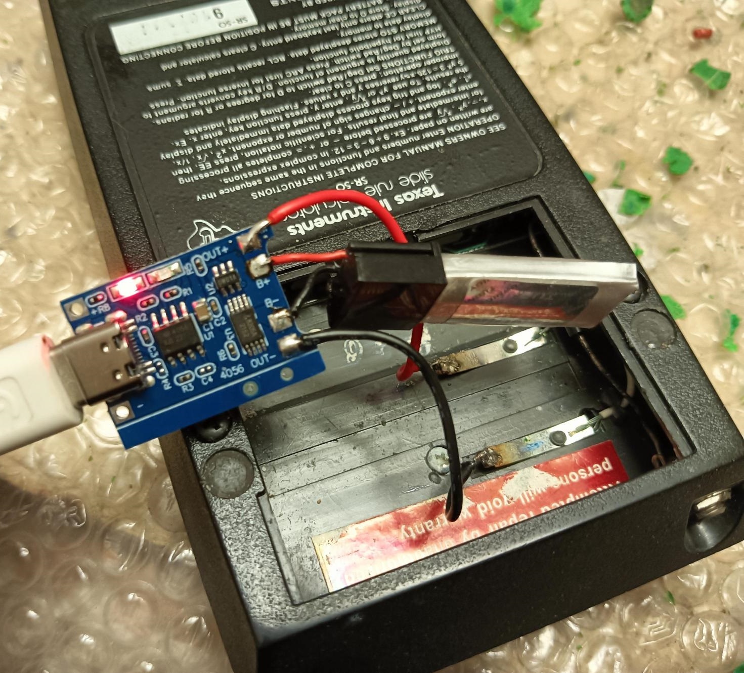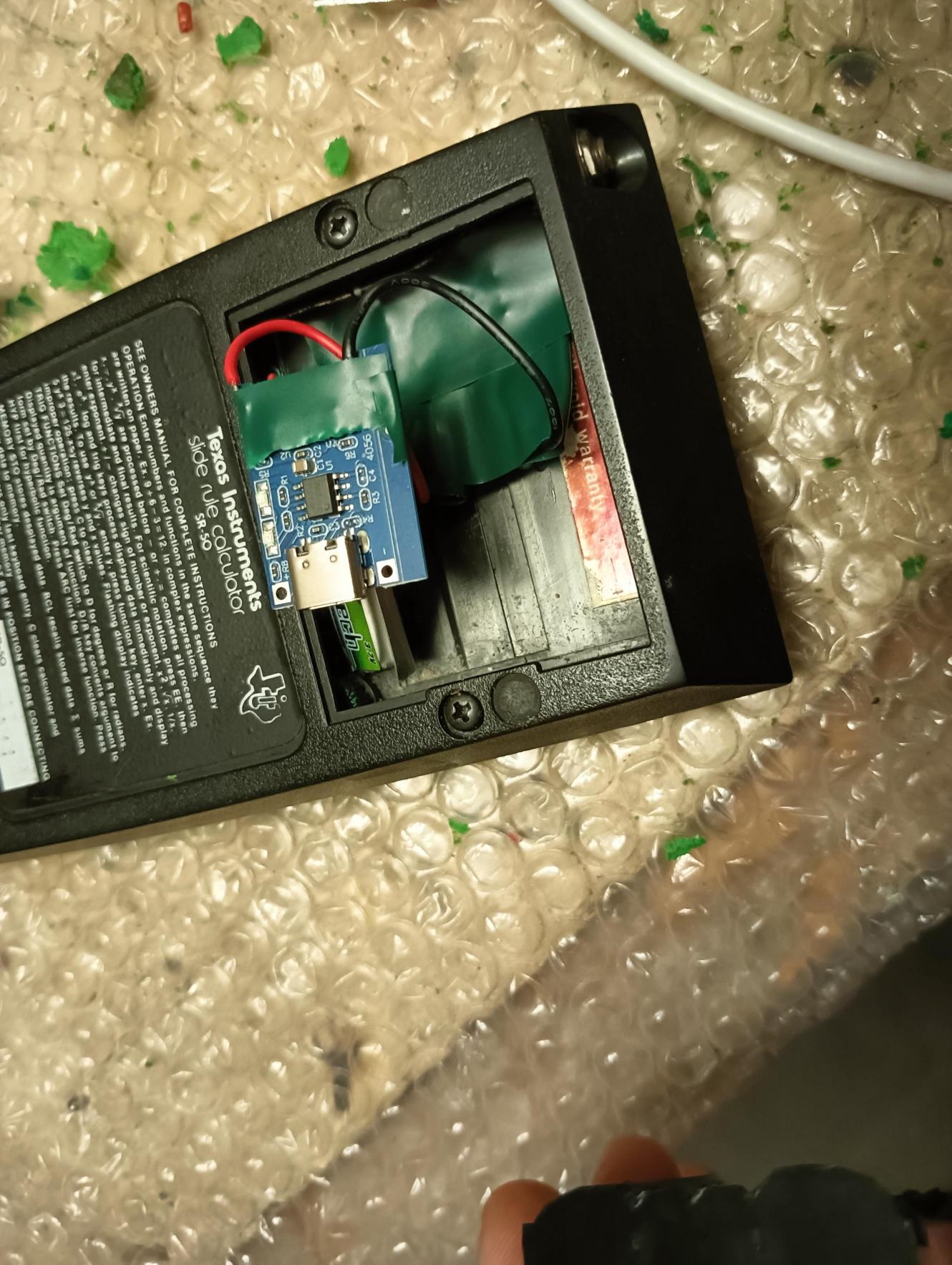 Invece che sostituirle con delle analoghe batterie NiMH ho pensato di fare un "aggiornamento" e sostituire le tre pile AA con una cella al lito che avevo sottomano; per la ricarica ho utilizzato un piccolo modulo basato sul TP4056, facendo a meno dell'alimentatore originale e potendo usare una normale porta USB per la ricarica.
