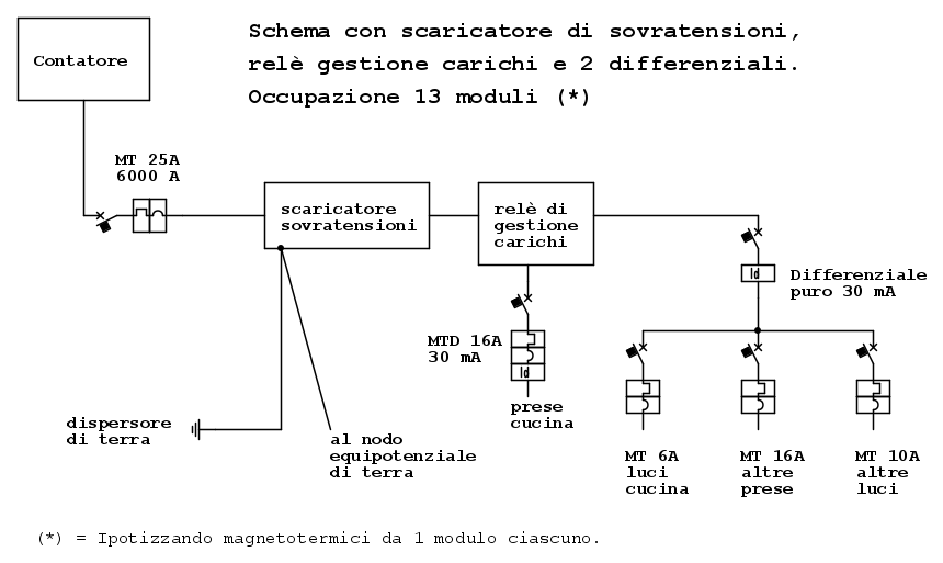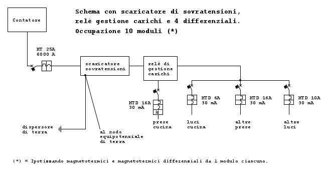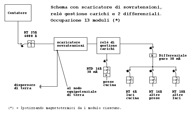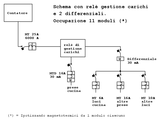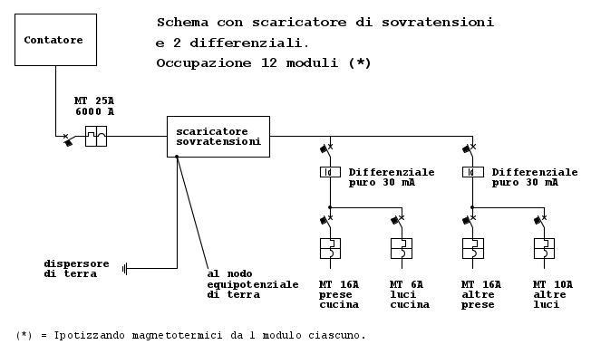 • la capienza dei quadri elettrici "standard" è normalmente di 12 moduli, per cui, disponendo presumibilmente di un centralino di tale capacità, già il primo schema non sarebbe attuabile con i dispositivi attualmente più utilizzati;