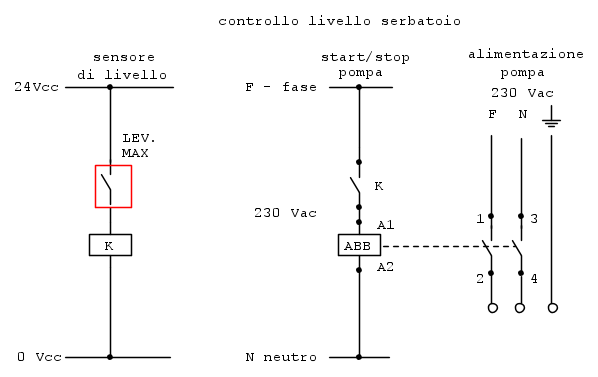mir ha scritto:Ora, occorre considerare che un livello non può direttamente comandare l'alimentazione di una pompa, per motivi di portata amperometrica, e ancor prima per tensioni di isolamento; non è sicuro mandare la tensione di rete su un livello max di un serbatoio, in questi casi si lavora in bassissima tensione (24 Vdc) , pertanto sarà necessario un relè di appoggio (chiameremo R) al sensore di livello max (chiameremo Lmax), e poi con il contatto del relè di appoggio si andrà a comandare il contattore (chiameremo K) che alimenterà il motore della pompa alla tensione di rete.