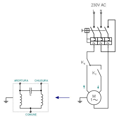 Hai parlato di motori in corrente alternata, se si utilizzasse un asincrono monofase il circuito di potenza potrebbe essere del tipo: