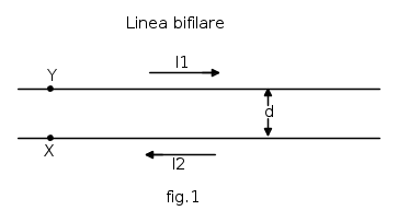 La fig. 1 - illustra con un esempio realizzato mediante due conduttori paralleli nei quali scorre rispettivamente la corrente I1 e la corrente I2, avente senso contrario. Se la corrente I1 ha, nel punto Y del conduttore superiore, lo stesso valore che ha la corrente I2 nel corrispondente punto X del conduttore inferiore, il campo conseguente da ognuna delle due correnti ha la stessa ampiezza. Poiché però le due correnti, scorrono in opposizione da fase, il campo di una risulterà esso pure sfasato di 180° rispetto all’altro.