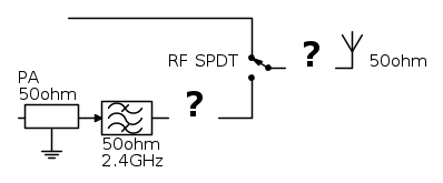Lavoro a 2.4GHz e devo capire cosa mettere tra questo PA che è completamente bilanciato in impedenza a 50ohm e l'antenna da 50ohm... anzi... per essere ancora più precisi, siccome il circuito prevede anche un LNA per la catena di ricezione quello che dovrei capire è: