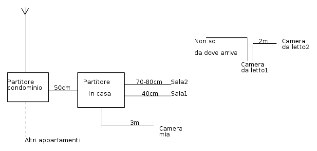 Penso sia fatto così l'impianto. Penso perché non so se esista qualcosa sulla carta. Mio padre m'ha detto che l'antenna sul tetto si snoda su un partitore condominiale in facciata (ho il terrore che abbiano messo in cascata più partitori anzichè uno unico che si dirama nei vari appartamenti) quindi poi mi arriva quella che per me è la linea principale dell'appartamento che si dirama nelle due camere.